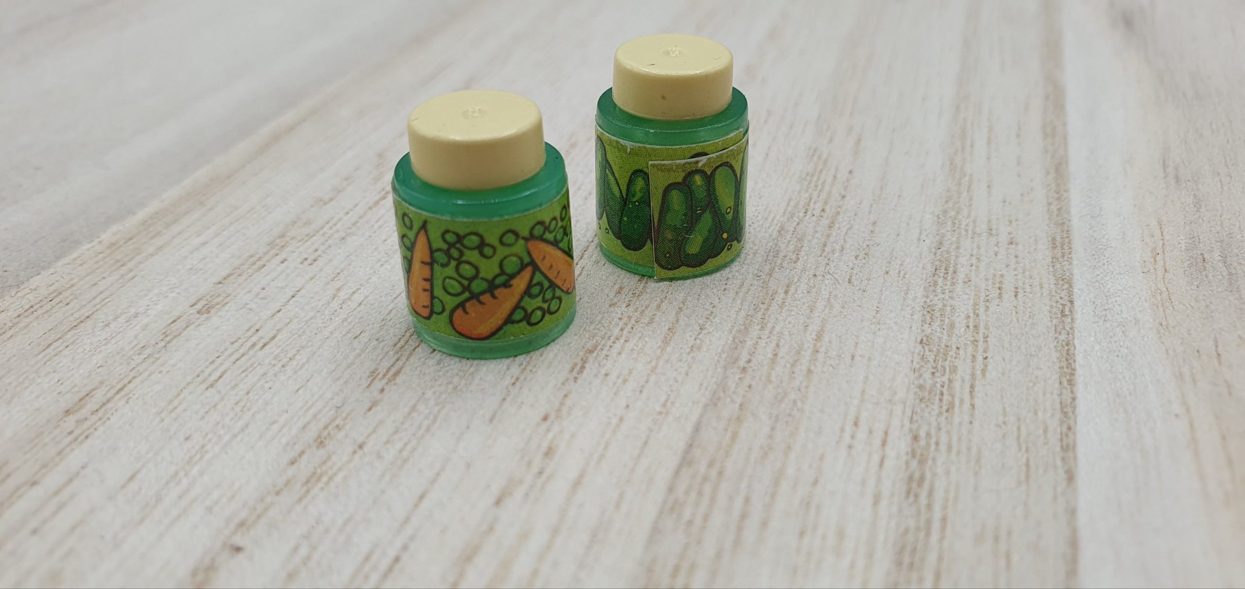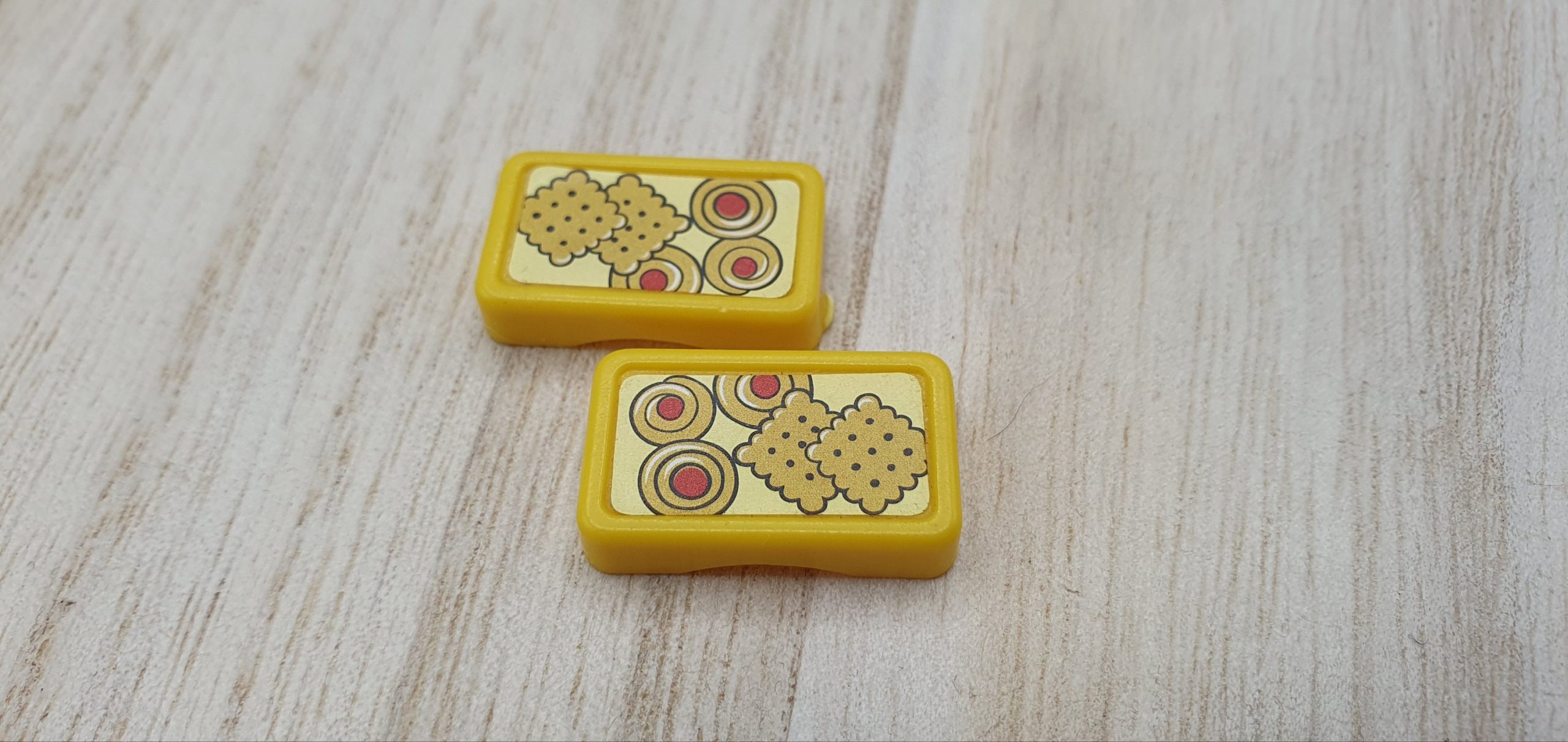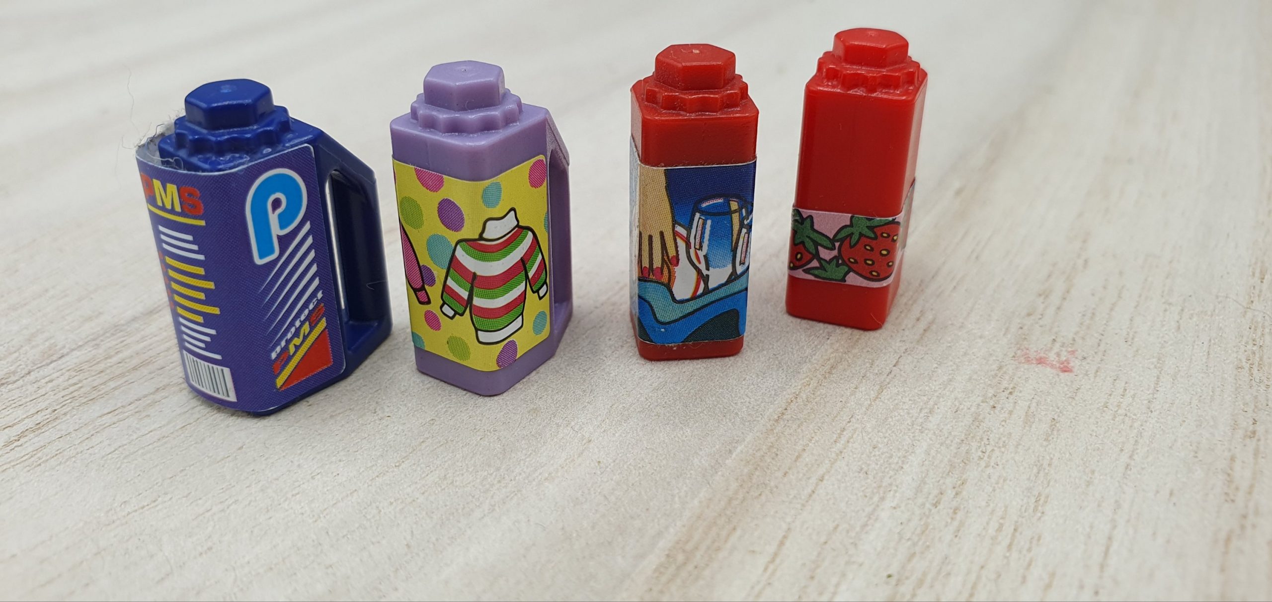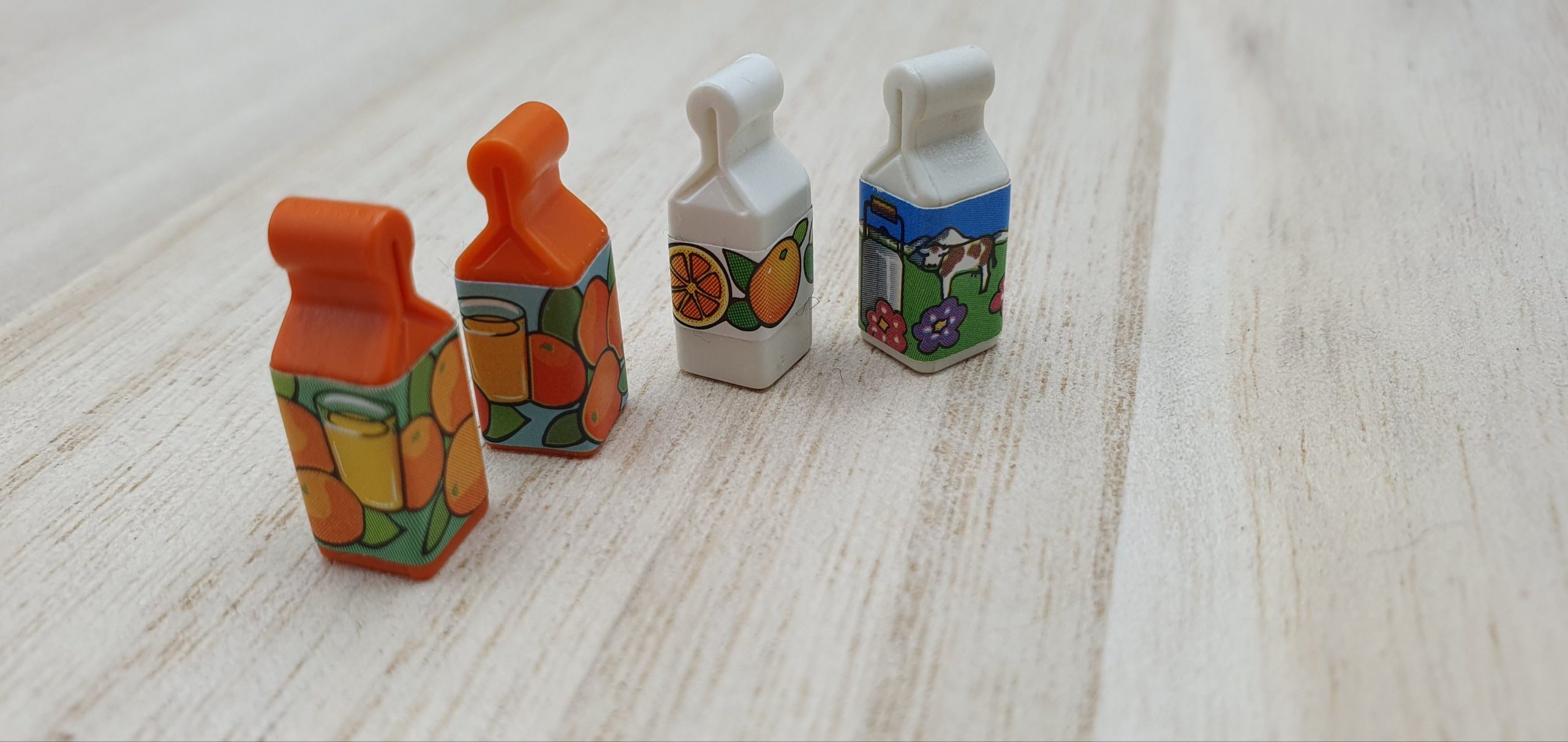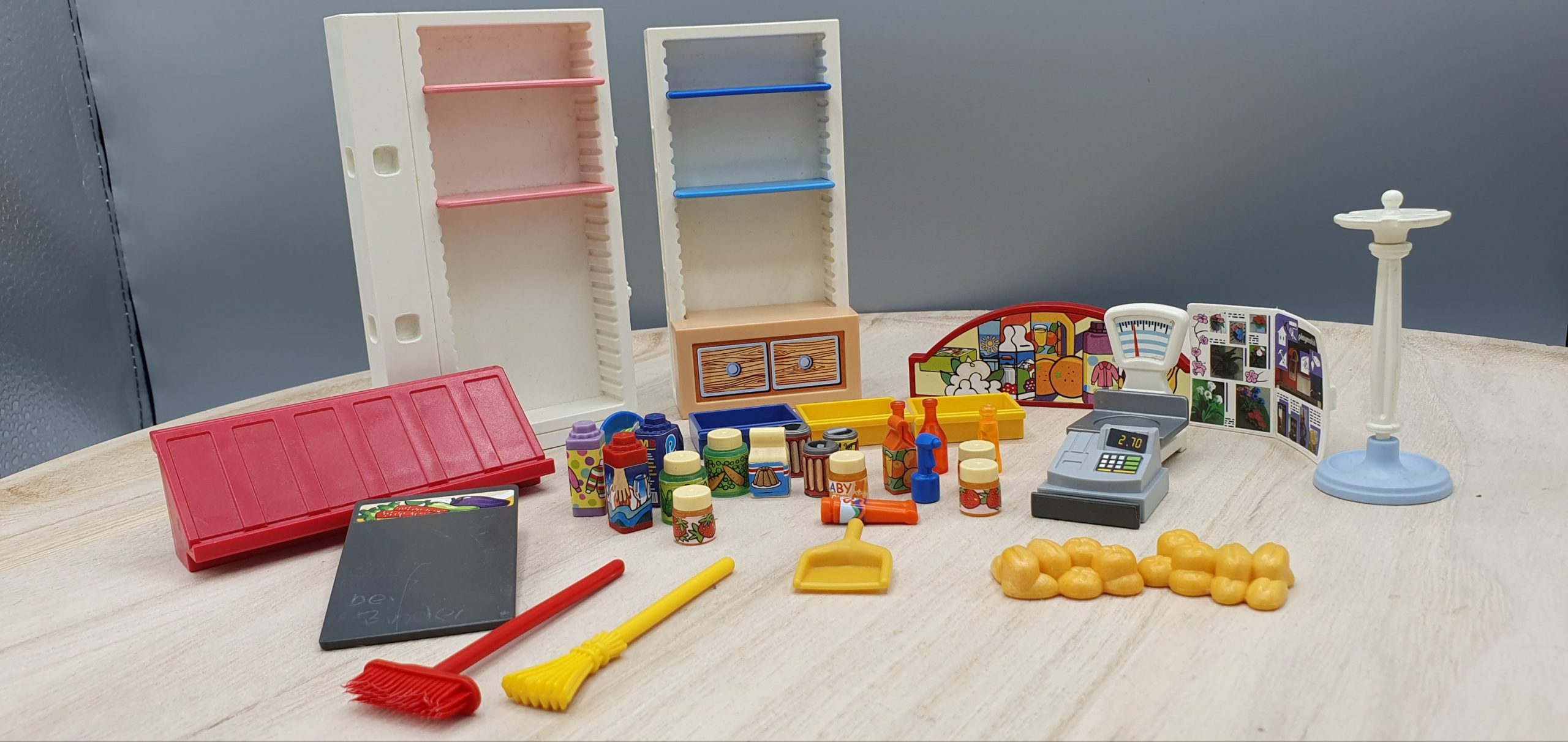 2x Besen, Brötchen, Kasse, Beschreibbares Schild, Dachteil, Ladenschild, Schublade Blau, Schublade Gelb, Zeitung, Schrank mit rosa Einlegeböden, Schrank mit blauen Einlegeböden, Schurmständer, Kehricht, 2x Gebäck, Flaschen und Tuben divers, 4x Tetrapack, 2x Gläser groß, 2x Mehl, 4x Gläser klein, 5x Dose, 4x Kanister, Sprühflasche